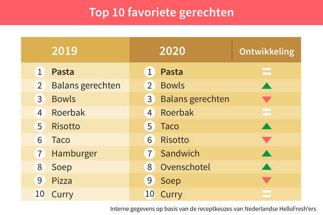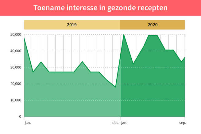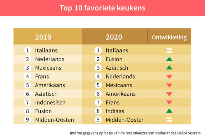 Terwijl we door de omstandigheden nauwelijks kunnen reizen, wordt er in de keuken heel wat afgereisd met recepten uit de Midden-Oosterse en Indiase keuken. In deze laatste categorie zijn tussen 2019 en 2020 enkele van de grootste stijgingen te zien, terwijl gerechten van eigen bodem in populariteit zijn afgenomen. Nederland stond in 2019 in de top 2 van populairste keukens, terwijl het in 2020 niet eens de top 3 haalt.