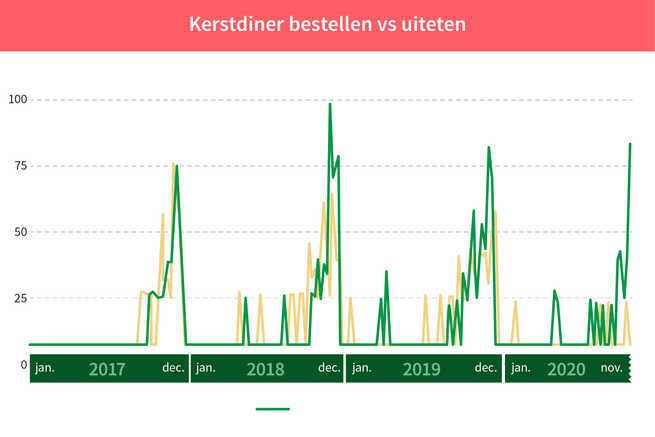 Steeds meer Nederlanders gaan voor een kerst zonder stress. Al jaren zien we de trend van een 'gemakkelijk' kerstdiner toenemen. Van een maaltijdbox tot een compleet kerstmenu aan je deur. Vanaf 2017 stijgt de vraag naar maaltijdboxen voor kerst ieder jaar opnieuw, ziet HelloFresh. Maar Nederlanders zoeken ook ieder jaar meer naar 'makkelijke kerstrecepten'. De stress van een moeilijk kerstdiner willen we voorkomen. Gezelligheid en samen zijn is toch ook veel belangrijker?