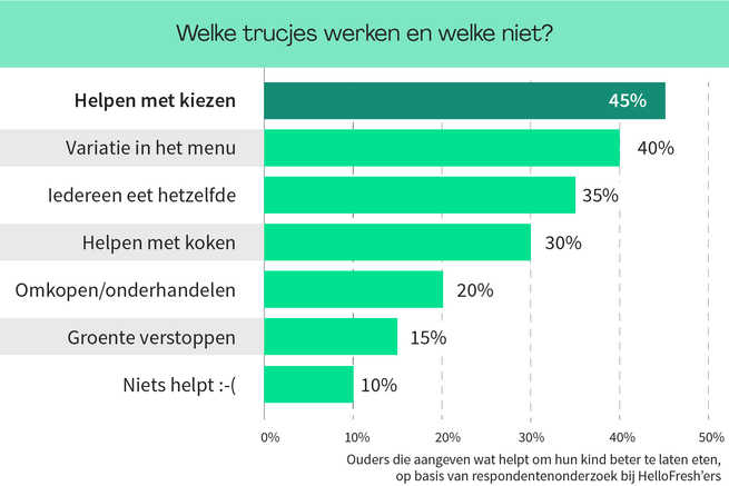 Denk jij slim te zijn door je kind om te kopen? Extra schermtijd, een toetje… slechts een vijfde van de ouders geeft aan dat dit zin heeft. Verstop je de boontjes onder het vlees? Of snijd je de paprika zo klein dat het niet meer opvalt in de pastasaus? Jammer maar helaas: ook groente verstoppen of vermommen trappen de meeste kinderen niet in (85%).