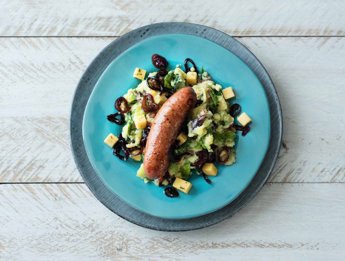 Verdeel de andijviestamppot over de borden, garneer met de gebakken rode ui en kruidenkaasblokjes. Serveer met de peterselie & knoflookworst.