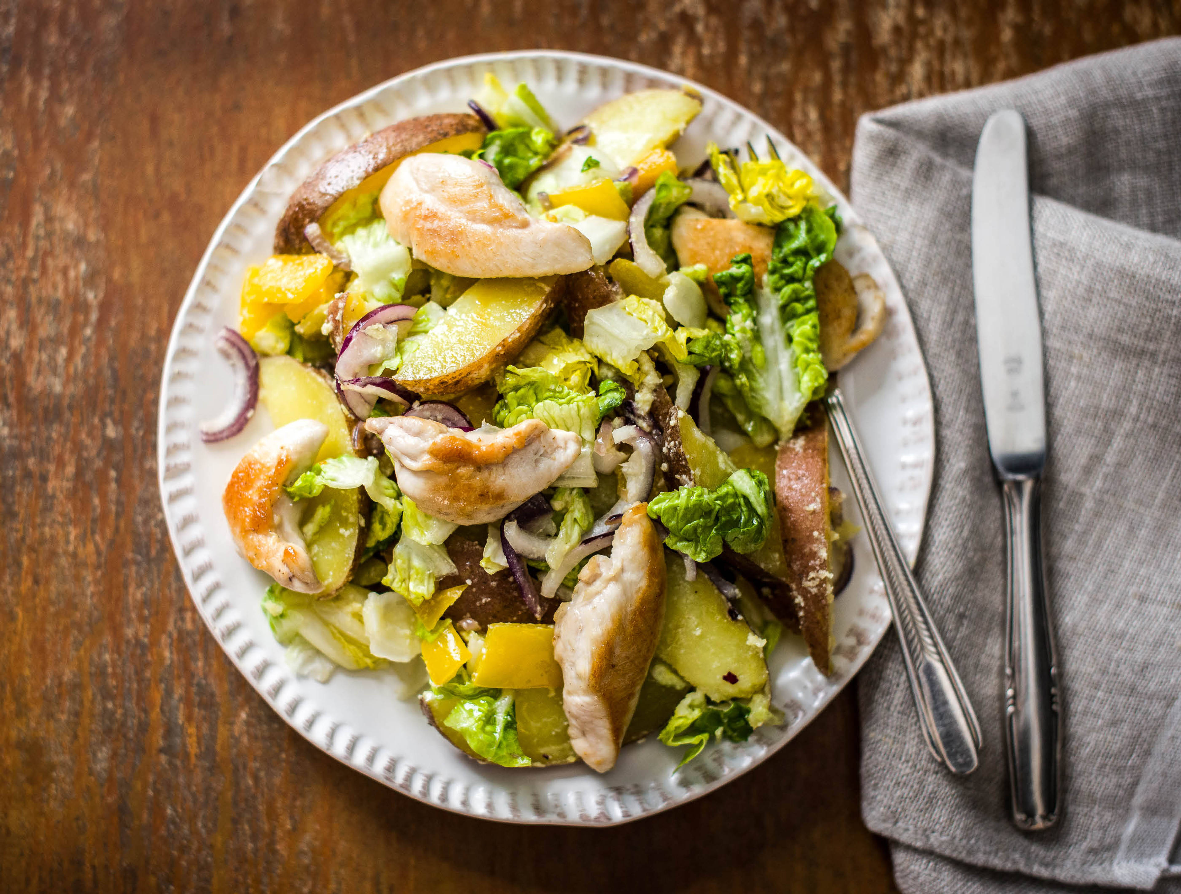 Scheur 3 blaadjes per persoon van de little gem en houd apart. Snijd de overige little gem grof. Meng de little gem door de honing-gembermayonaise in de saladekom.