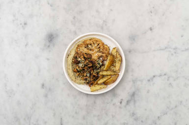 Breng ruim water met een snuf zout aan de kook in een pan met deksel. Snijd 2 plakken van 2 cm uit het midden van de bloemkool. De stam van de bloemkool blijft eraan zodat de roosjes er niet afvallen. Bewaar de bloemkool 'steaks' apart. Snijd de rest van de bloemkool in kleine roosjes. Kook de bloemkoolroosjes, afgedekt, in 10 - 12 minuten gaar, giet af en laat zonder deksel uitstomen.