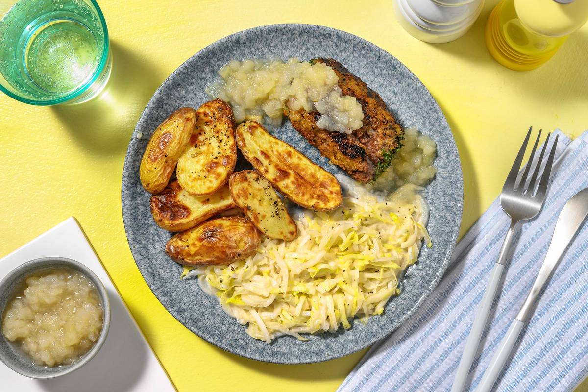 Verdeel de witloofsalade over de borden. Schep de krieltjes en het boomstammetje op de borden. Serveer met de perenmoes.