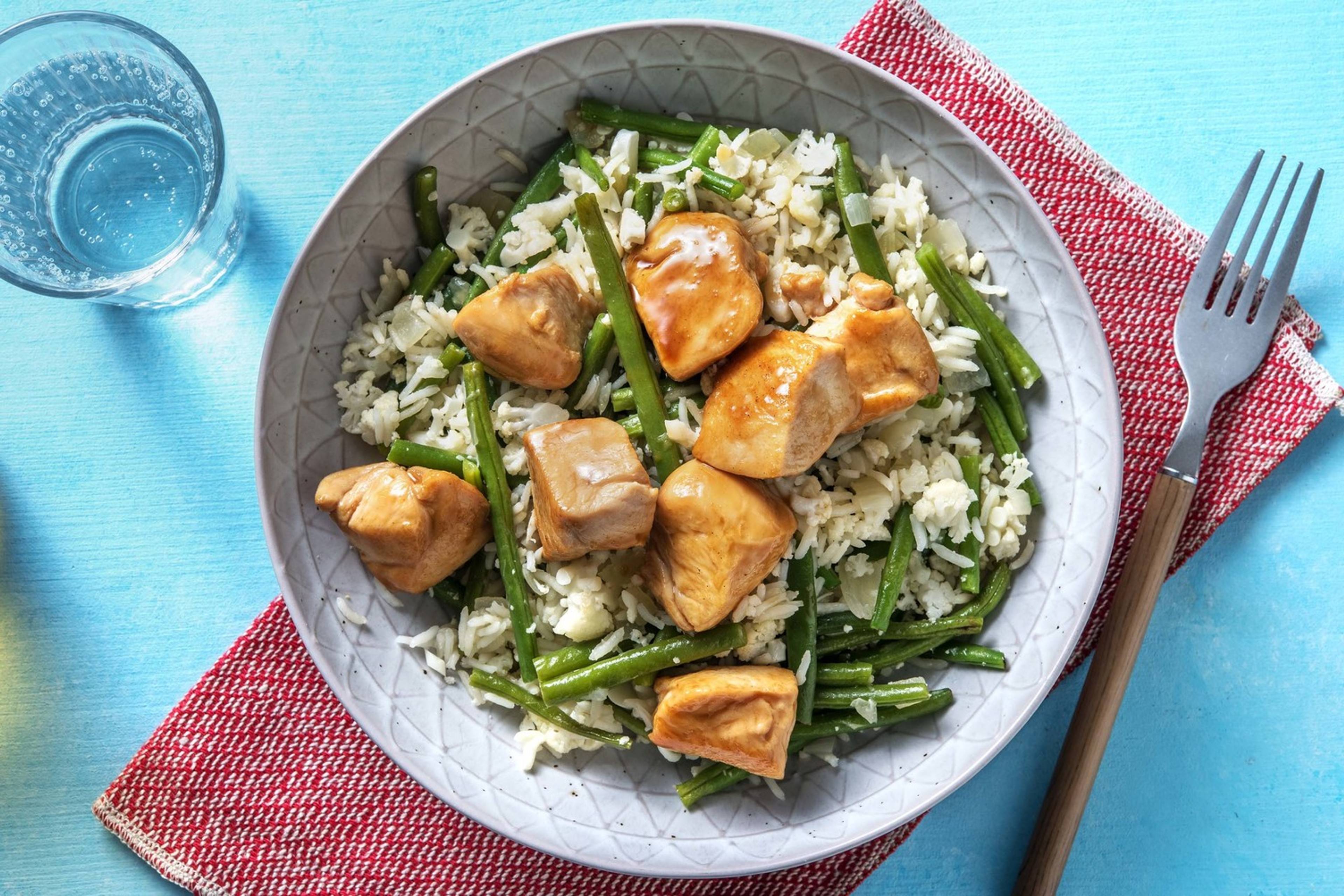 Verhit de olijfolie in een wok of hapjespan met deksel op hoog vuur en roerbak de kippendijstukjes samen met de sperziebonen 3 - 4 minuten.