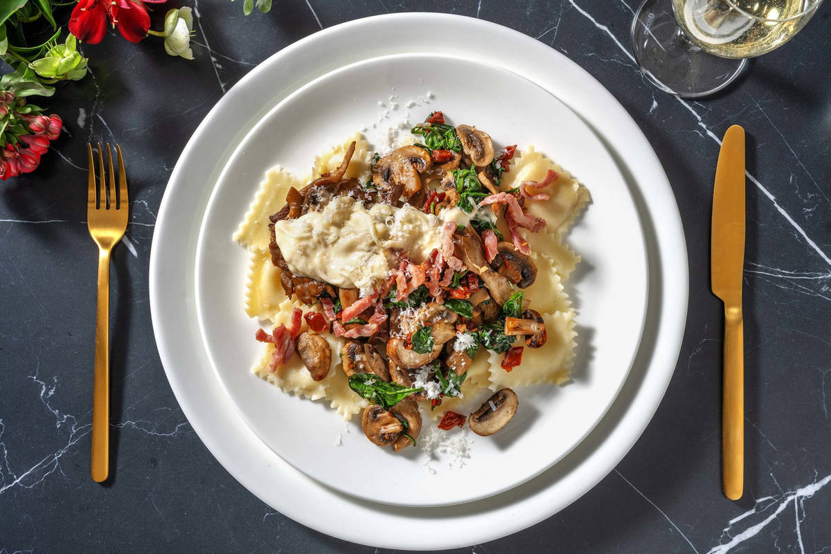 Breng ruim gezouten water aan de kook in een pan met deksel voor de ravioli. Verhit een grote koekenpan op middelhoog vuur en bak het ontbijtspek 5 - 6 minuten, zonder olie, tot deze goudbruin en knapperig is. Leg het spek op het stukje keukenpapier en snijd deze in plakjes. Zet opzij. Verhit in dezelfde koekenpan een scheutje olijfolie op middelhoog vuur. Voeg de champignons toe en bak 3 - 4 minuten. Breng op smaak met peper en zout.