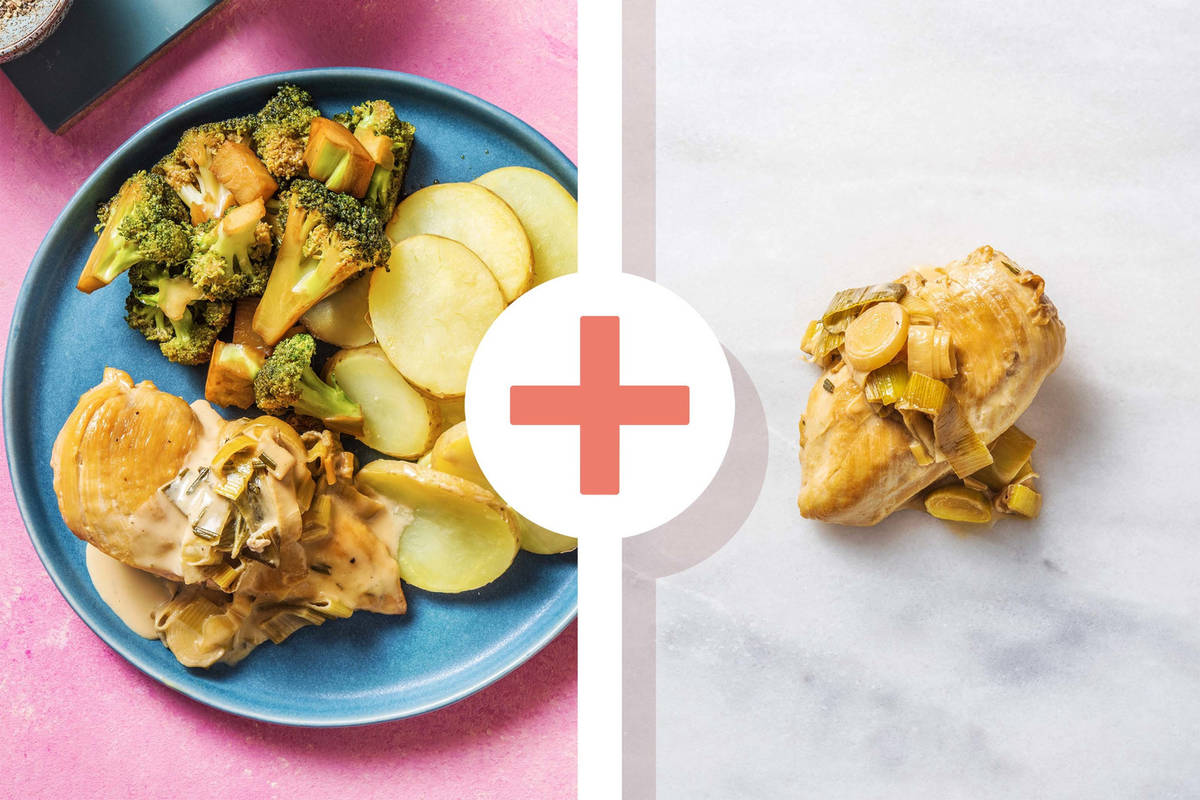 Blus de prei af met 75 ml bouillon per persoon. Voeg de mosterd, wittewijnazijn en rozemarijn toe. Verlaag het vuur, voeg de slagroom toe en laat 12 minuten inkoken. Voeg de laatste 5 minuten de kip toe, zodat deze verder kan garen.