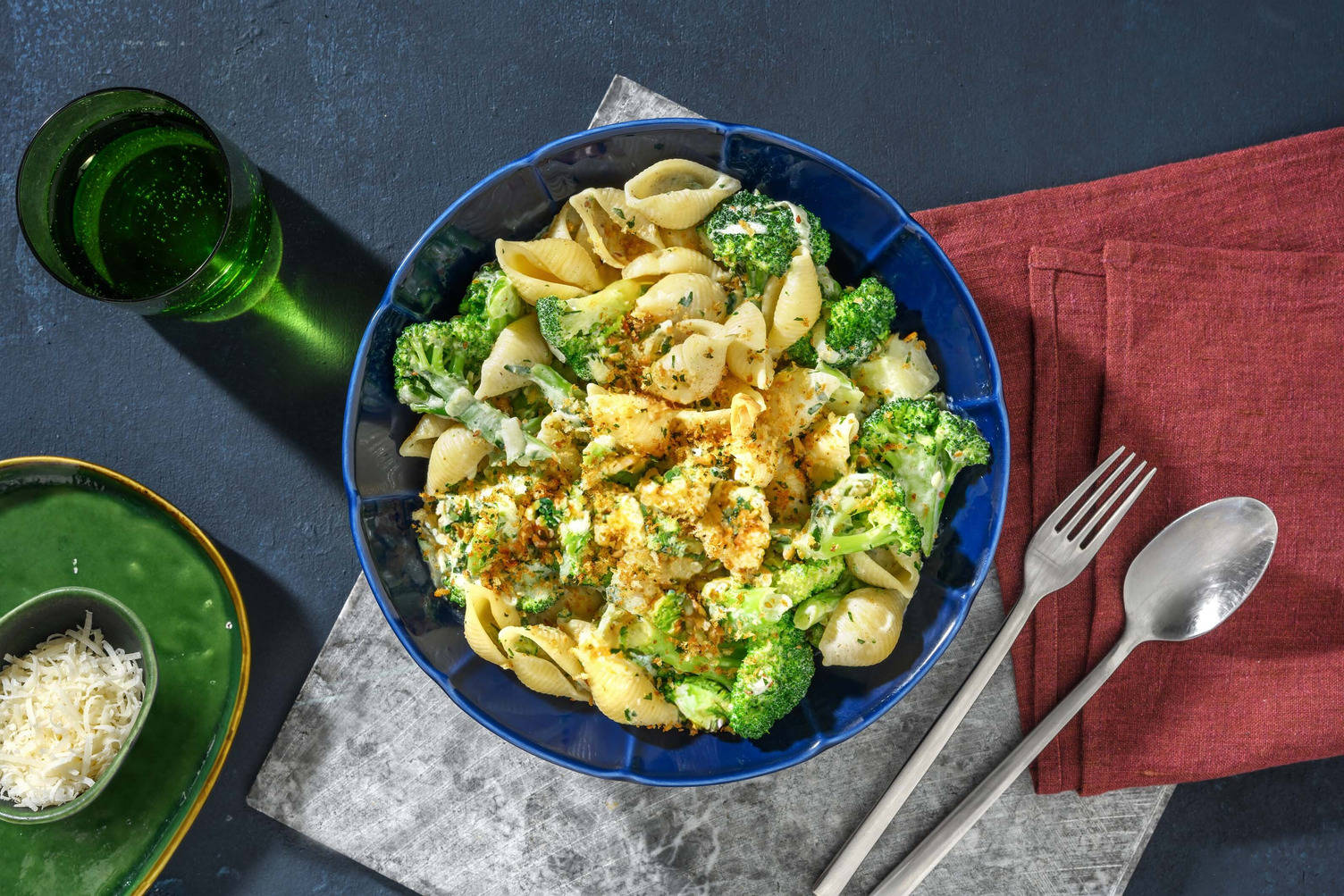 Breng ruim gezouten water aan de kook in een grote pan met deksel voor de pasta en broccoli. Rasp de komkommer met een grove rasp. Snijd de verse krulpeterselie fijn. Weeg de conchiglie af en en kook afgedekt, 14 - 16 minuten. Kook de laatste 4-6 minuten de broccoliroosjes mee. Giet daarna af, bewaar wat van het kookvocht en laat zonder deksel uitstomen.