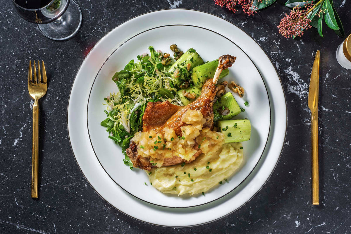 De eendenpoot is gekonfijt in ganzenvet - een bom van smaak en extra mals door de langzame garing. Dat levert een restaurantwaardige maaltijd op.