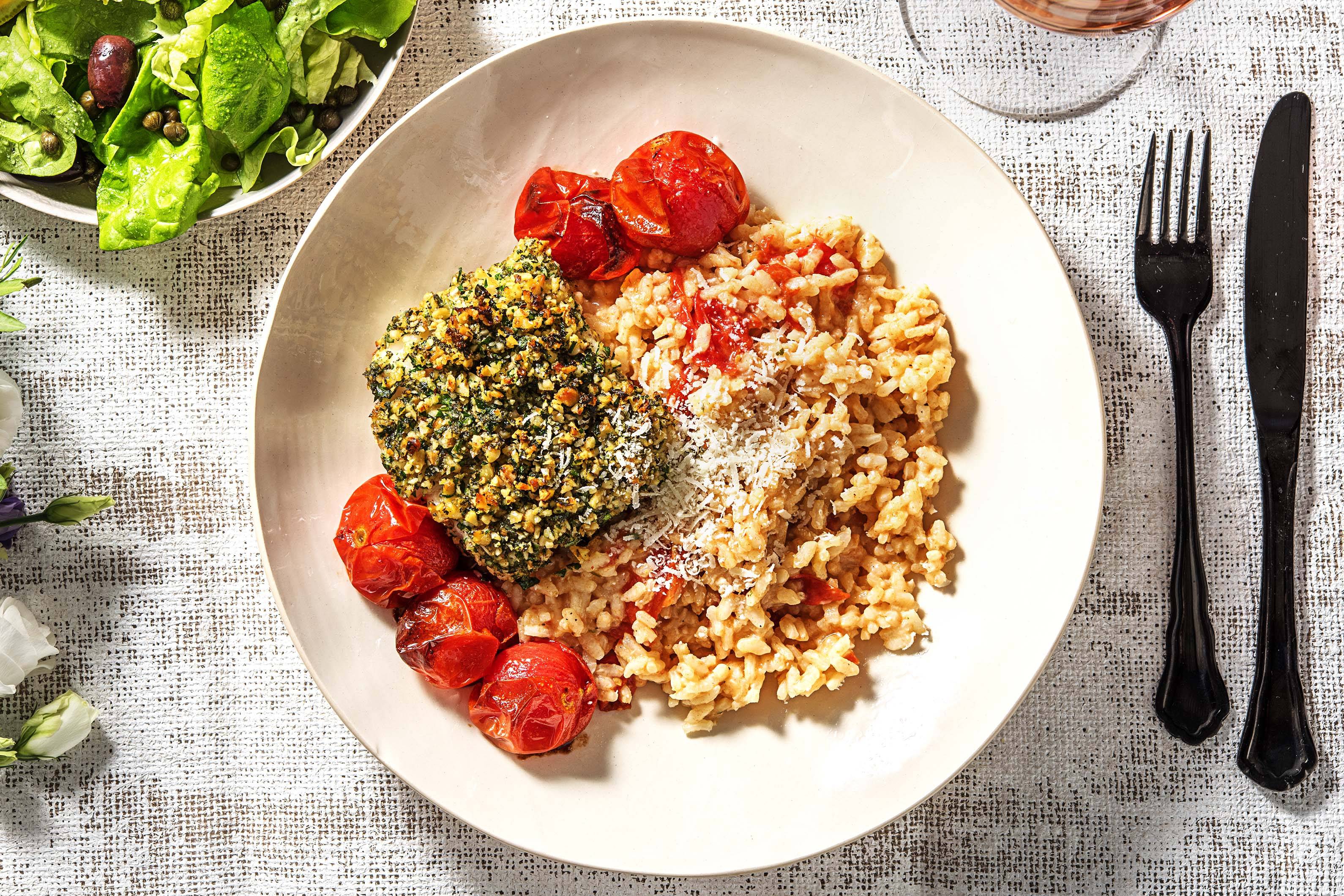 Roer de helft van de chocovlokken door de havermout en verdeel over door de havermout en verdeel over