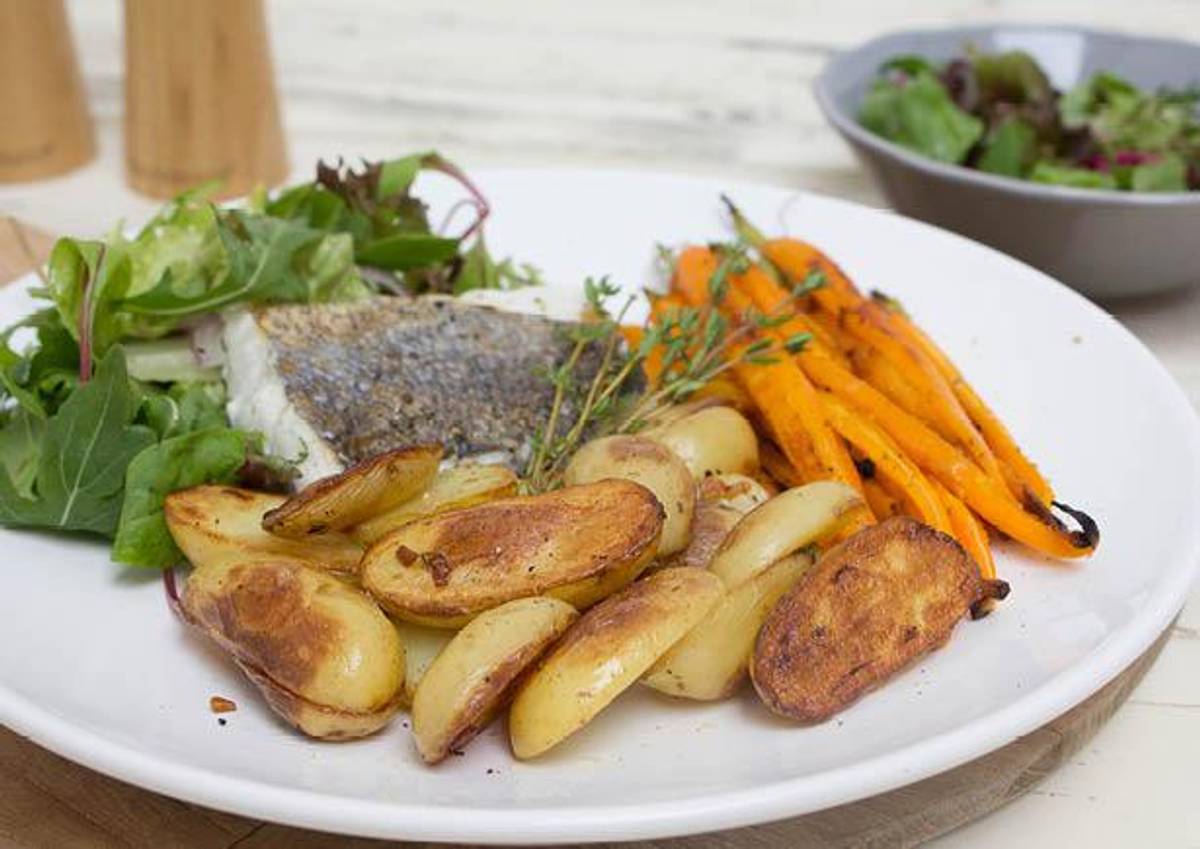 Heekfilet met geroosterde bospeen en gebakken tijm-krieltjes
