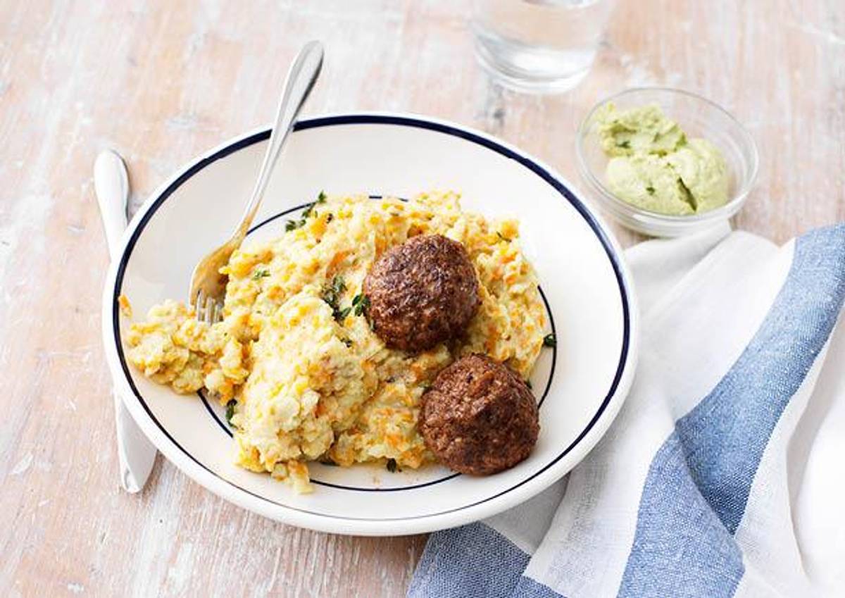 Hutspot met gehaktballen en koriander-limoen hoemoes