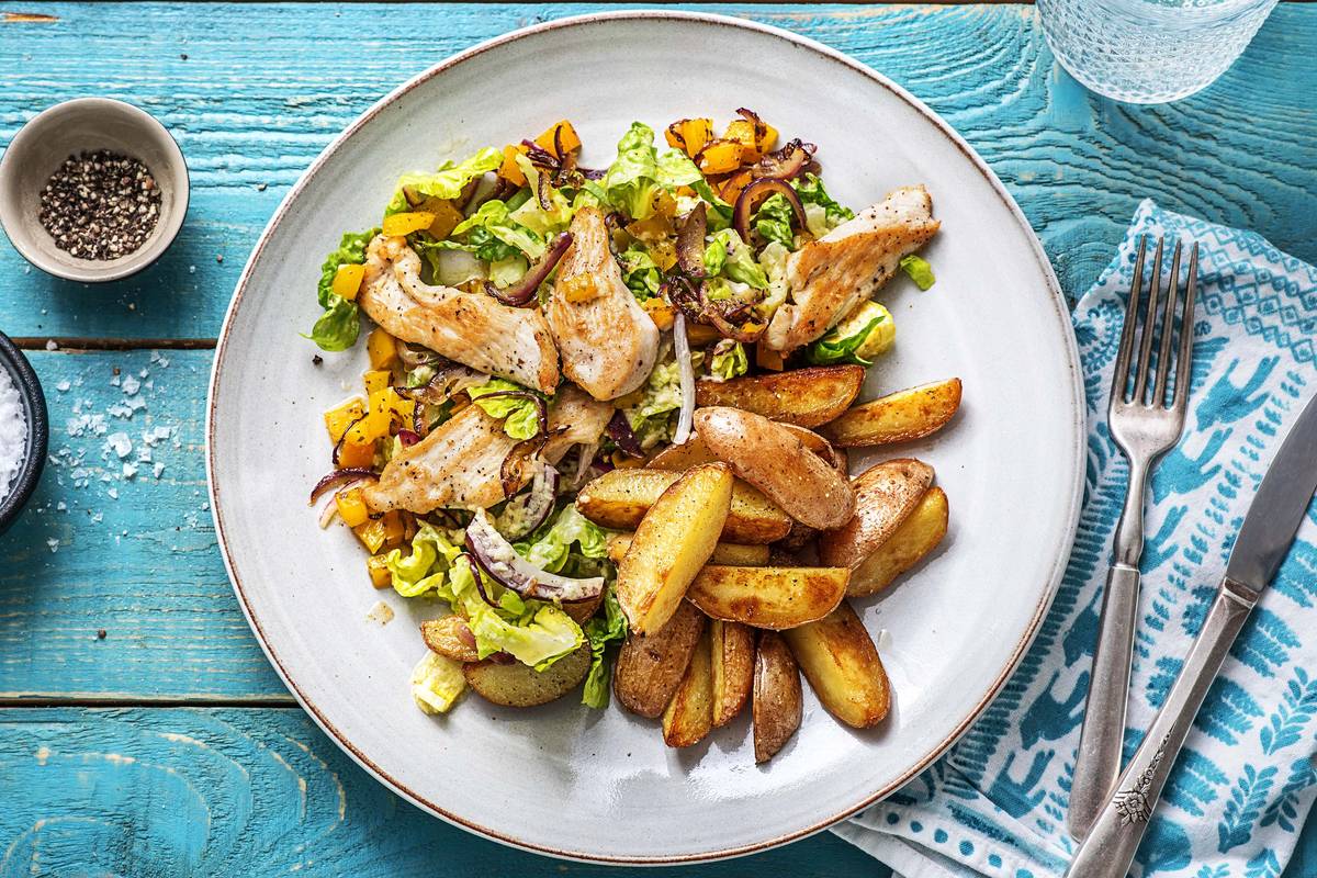 Verdeel de salade over de borden en leg er de kipfilethaasjes op. Serveer met de gebakken aardappelen.