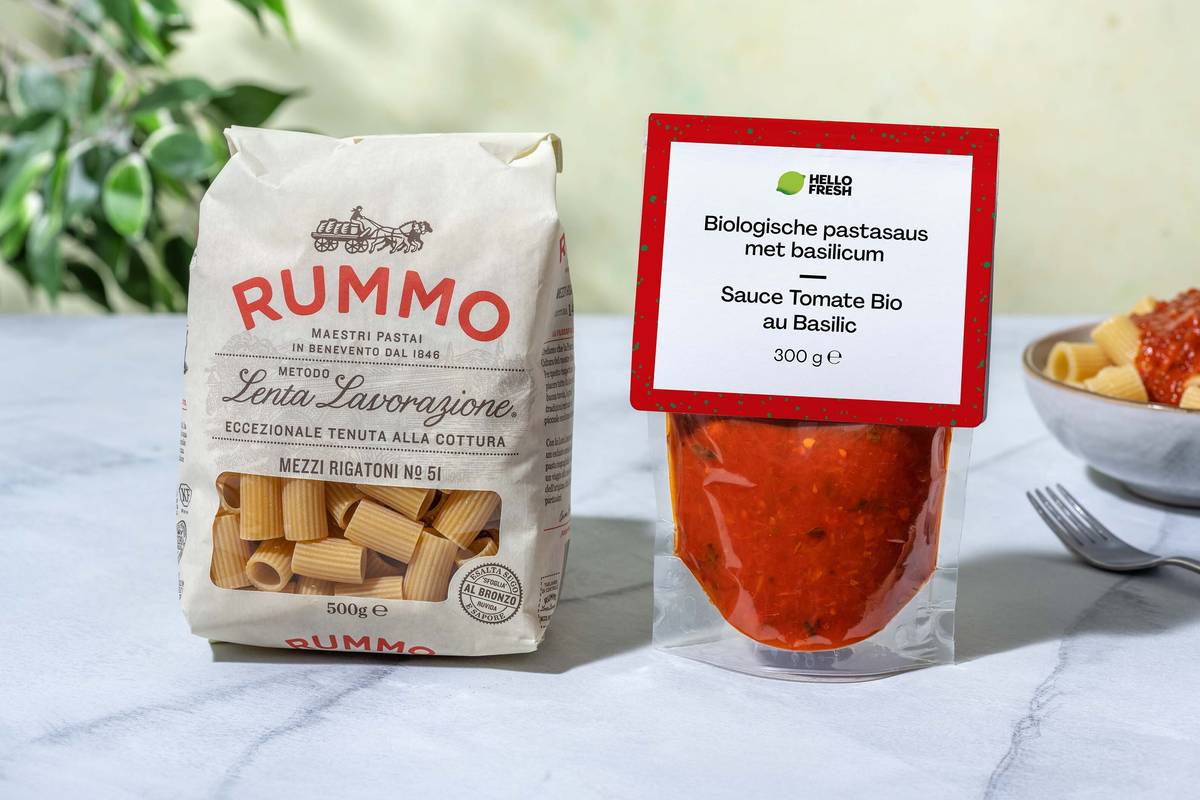 Met dit perfecte pastaduo van rigatoni en biologische tomatensaus met basilicum waan je je zo in Italië. Voeg zelf nog groenten en/of vlees toe en klaar is kees!<p><p> Dit pakket bevat: <p><p> <a href="https://www.hellofresh.nl/recipes/rigatoni-6008370EF145E6648B2FED32/">Rigatoni</a><p> <a href="https://www.hellofresh.nl/recipes/pastasaus-met-basilicum-60083723ACF77A7B8B025FF5/">Pastasaus met basilicum</a><p> <p><p> <small>HelloFresh doet er alles aan om te zorgen dat de productinformatie zo nauwkeurig mogelijk is. De recepten van producten worden regelmatig herzien en verbeterd, wat inhoudt dat voedingswaarden, informatie over allergen (inclusief ‘kan sporen bevatten van’-verklaringen), ingrediënten en andere product details kunnen worden gewijzigd. Controleer bij ontvangst altijd de productetiketten voordat je het product consumeert. Vertrouw niet uitsluitend op de hier verstrekte informatie. Voor specifiek advies over een product kan je contact opnemen met onze klantenservice. Voor producten die niet het HelloFresh-merk hebben, is het ook mogelijk om rechtstreeks contact op te nemen met de fabrikant.</small>