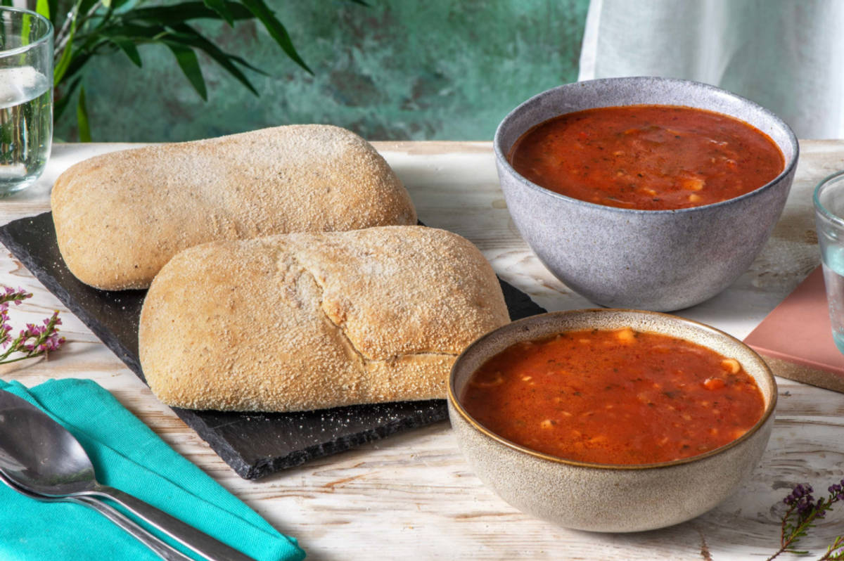 Deze stevige Italiaanse soep is rijkgevuld met groente en pastaschelpjes. De Italiaanse kruiden in het brood passen perfect bij de soep. Je hoeft de soep en het brood alleen nog even op te warmen - perfect tijdens een drukke dag of als je zin hebt in een snelle maaltijd boordevol groenten. Deze soep is gemaakt van de beste verse ingrediënten.