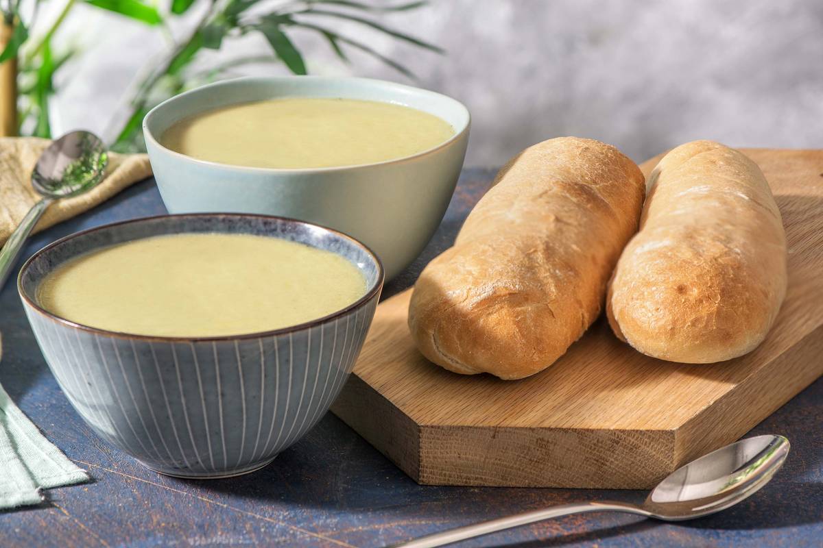 Je zet deze verse soep met brood in een handomdraai op tafel. Bak de baguette 6 minuten in een voorverwarmde oven op 180 graden. Giet de soep in een pan en verwarm al roerend tot het kookpunt.