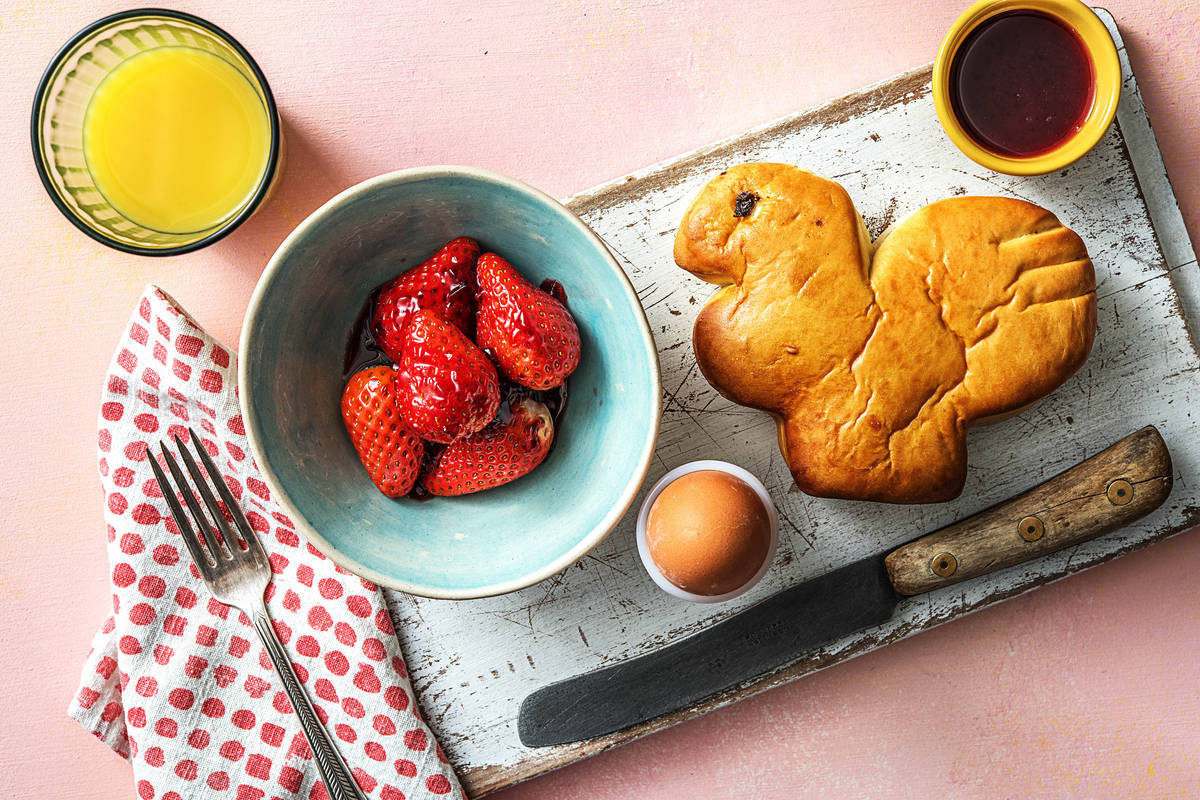 Serveer de paashaan met de appel-frambozenspread, het gekookte ei, de gemarineerde aardbeien en het versgeperste sinaasappelsap. Fijne Pasen!