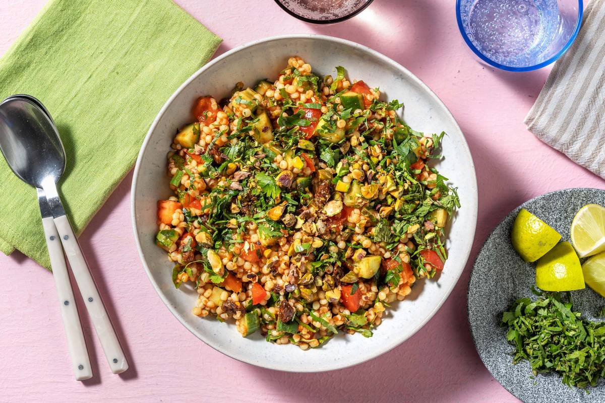 Supersimpele, lekkere recepten voor elk moment van de dag, inclusief receptkaart met 4 stappen en geportioneerde ingrediënten voor 2 personen. De pittige harissa in deze salade gaat goed samen met de frisheid van de groenten en het zoete van de rozijnen. De pistachenoten maken het helemaal af!