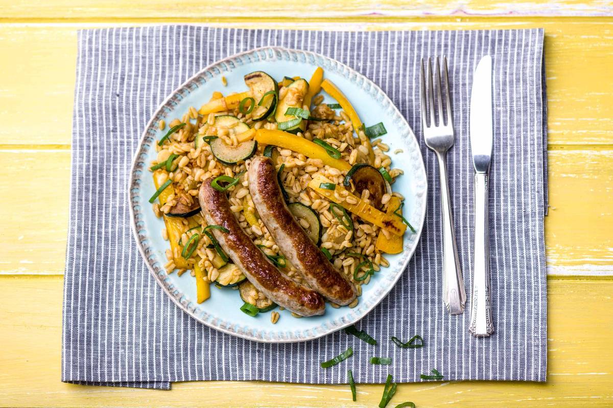 In dit gerecht zitten veel ingrediënten die we kennen uit de Midden-Oosterse keuken, zoals parelgerst, karwijzaad en merguezworstjes. Deze pittige worstjes, traditioneel gemaakt van rund-, lams- of schapenvlees, zijn gekruid met foelie, peterselie en laurier. We combineren het met verse groenten zoals gele paprika en courgette.