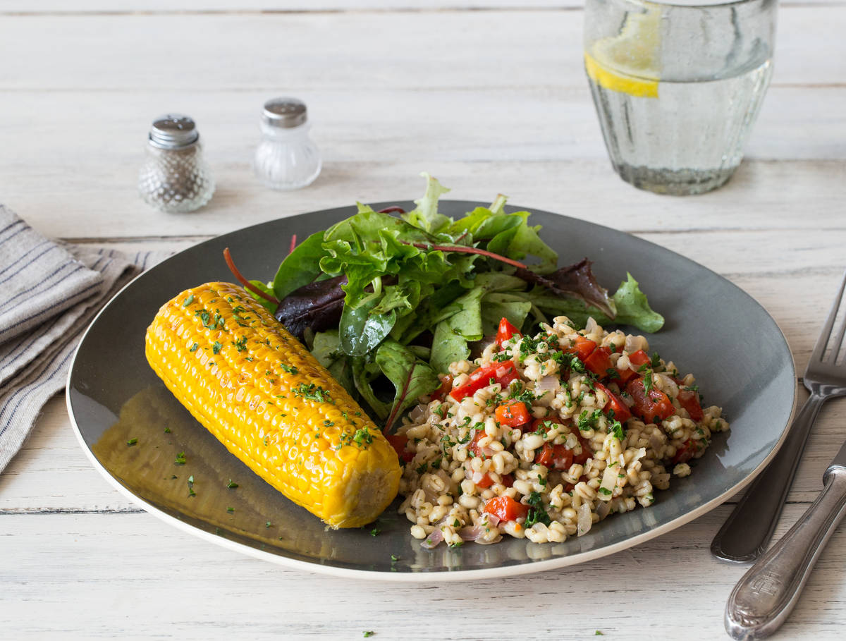 Voeg de paprika en pecorino bij de parelgerst en verdeel het gerecht over de borden. Garneer met de achtergehouden peterselie en serveer met de maïskolf en mesclun.