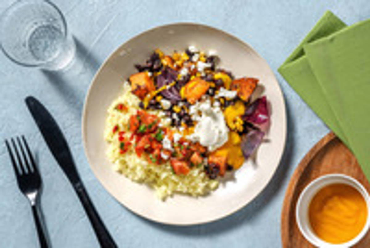 Meng de rode ui en zoete aardappel in een kom met per persoon: 1/2 el olijfolie, 1 tl Mexicaanse kruiden, peper en zout. Verdeel over een bakplaat met bakpapier en bak 25 - 30 minuten in de oven. Schep halverwege om. Verdeel de laatste 8 - 10 minuten de mais en de zwarte bonen naast de rode ui en zoete aardappel, samen met 1/2 el olijfolie per persoon, peper en zout.