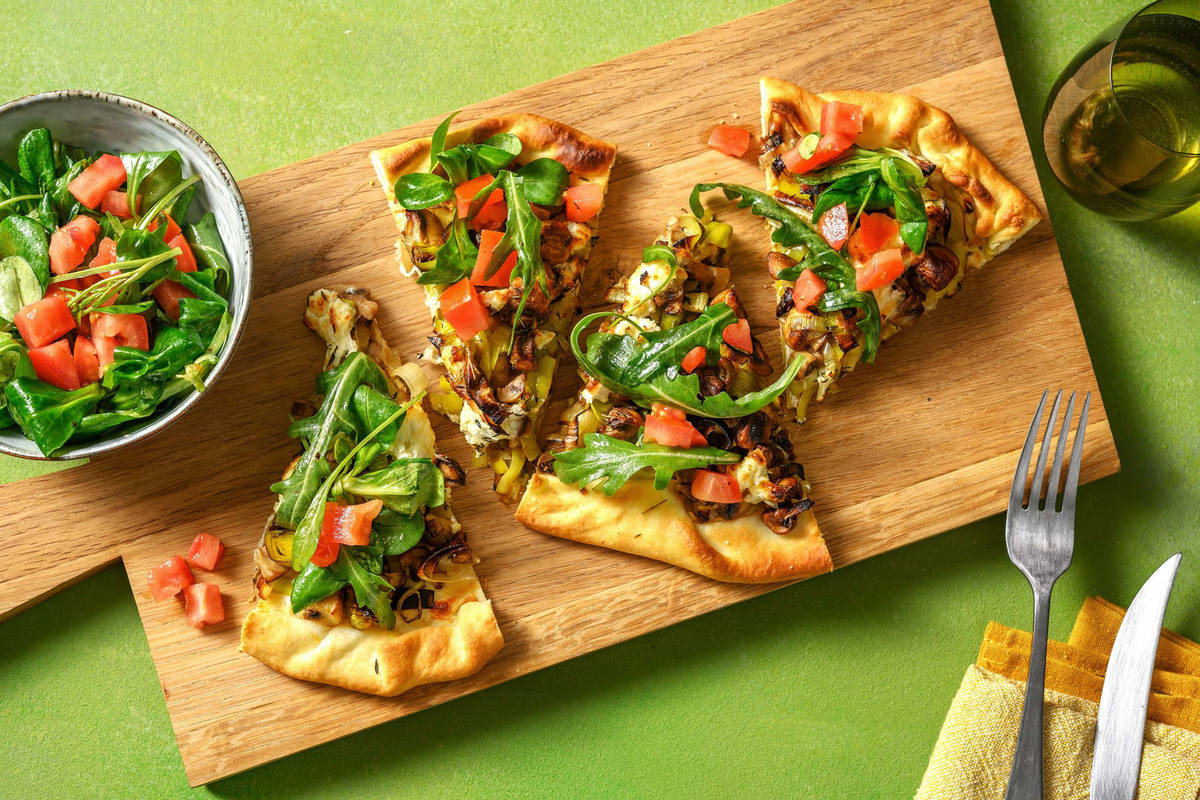 Verhit ondertussen 1/2 el olijfolie per persoon in een hapjespan met deksel op middelhoog vuur. Stoof de prei en champignons met de Italiaanse kruiden en 1 el water per persoon, afgedekt, 6 - 8 minuten. Breng op smaak met peper en zout.