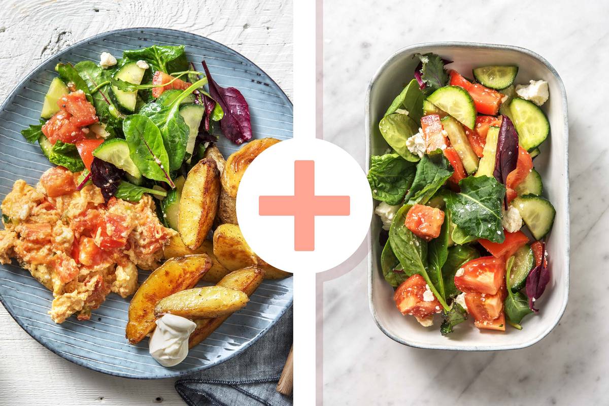 Meng in een saladekom de extra vierge olijfolie en de wittewijnazijn tot een dressing. Breng op smaak met peper en zout. Voeg de komkommer, de mesclun, de helft van de feta en 2 tomaten per persoon toe.