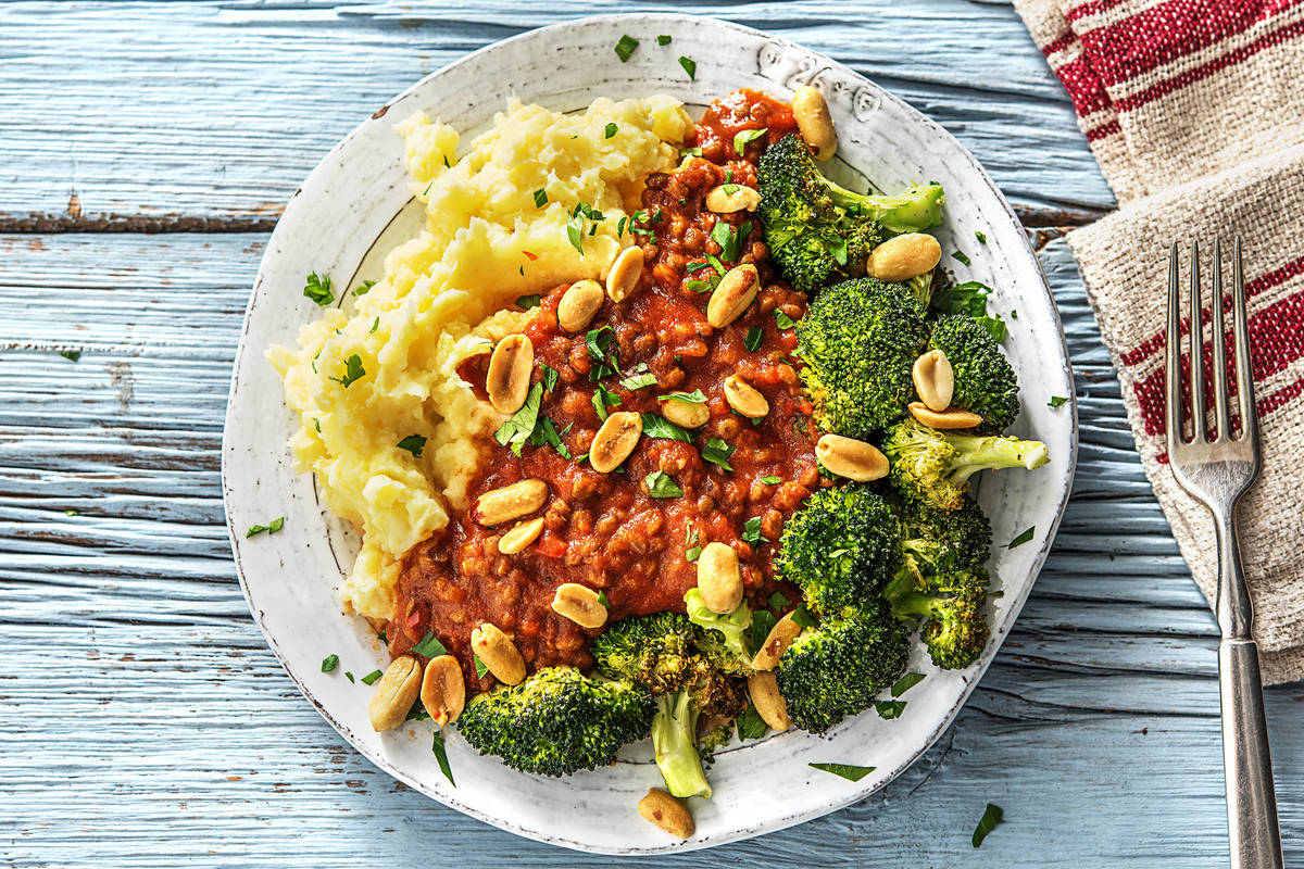 Verdeel de aardappelpuree over de borden en schep de linzen erop. Schep de broccoli eromheen. Bestrooi met de peterselie en garneer met de pinda's.