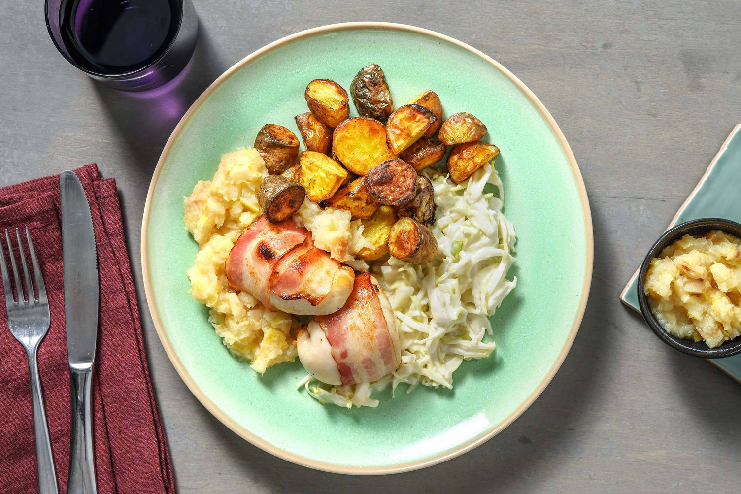 Schenk de smoothie over de kleingesneden peer in de ontbijtkommen en garneer met de overige cashewnoten-rozijnenmix.