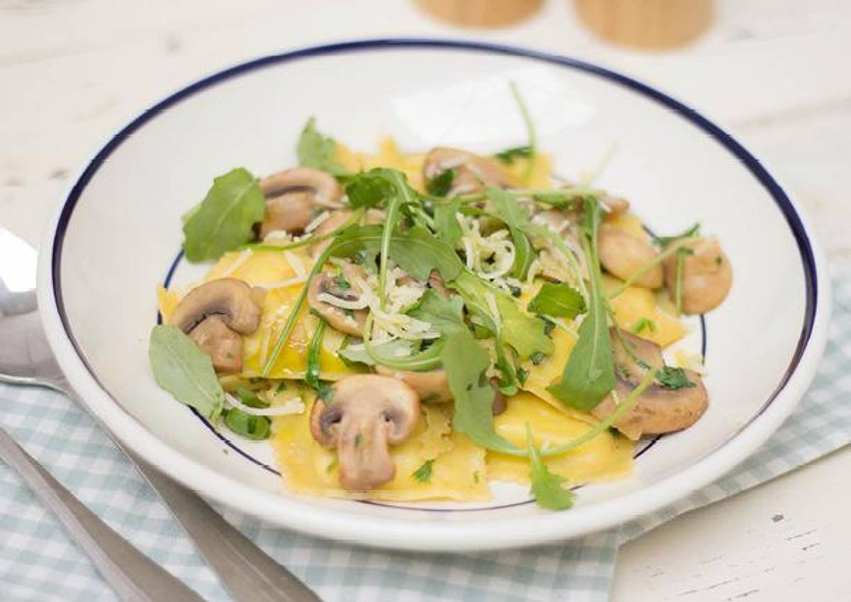 Truffelravioli met champignons, rucola en pecorino