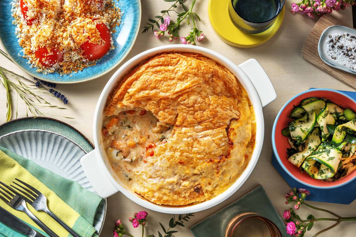 Serveer de vispastei met de courgette salade en de tomaten met panko.