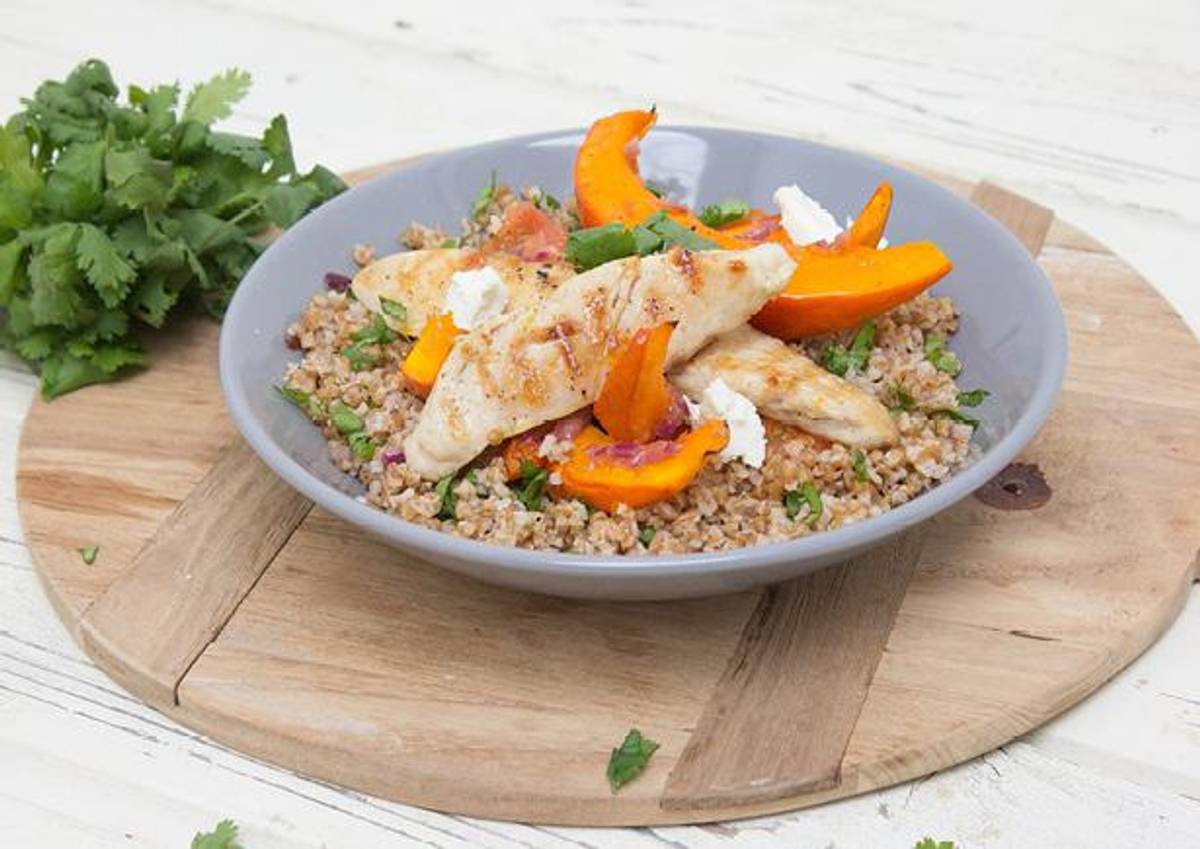 Volkoren bulgur met pompoen en gegrilde kalkoenfilet
