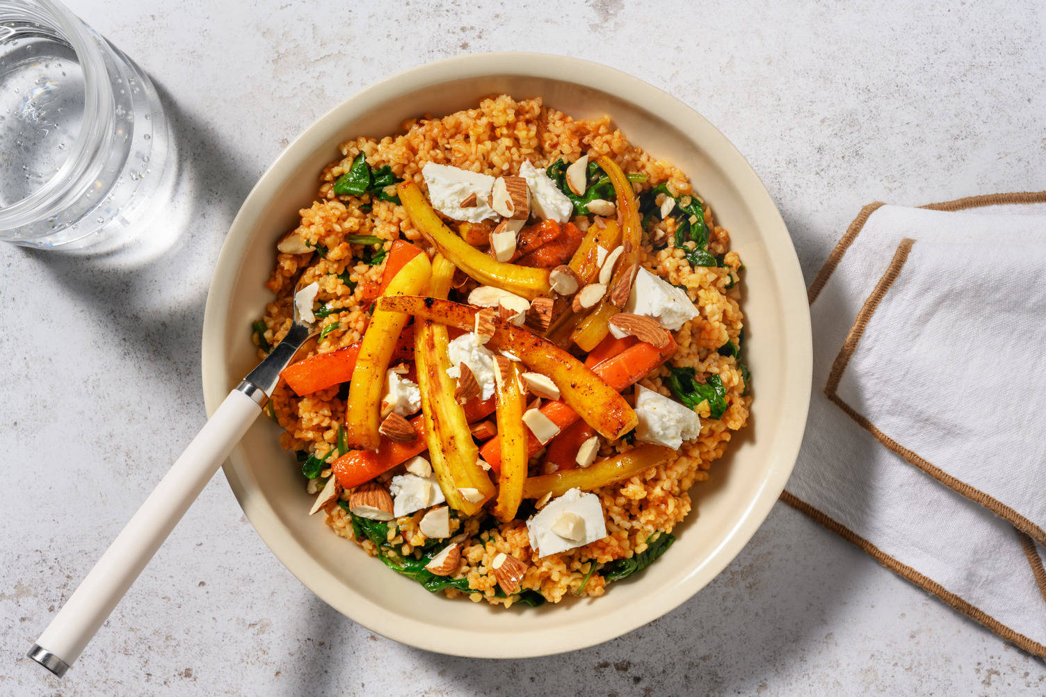 met kurkuma-bulgur, groene saus en pompoenpitten